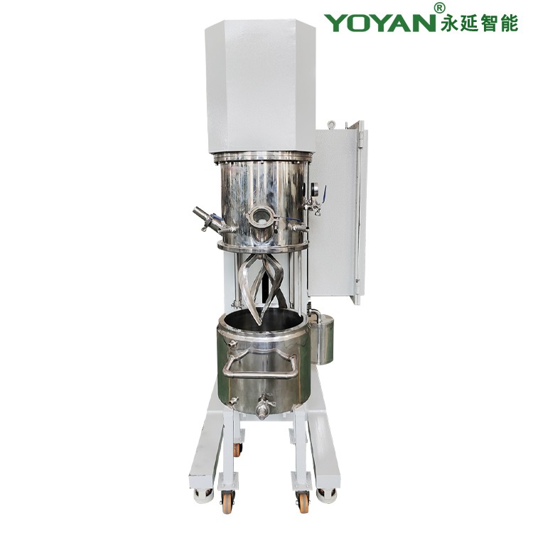 双行星真空搅拌机是一种高性能、高效率、易清洗维护的新型搅拌设备。主要由减速电机、行星架、搅拌器、分散器、刮壁器、料桶、升降系统、液压挤出系统以及机架等构成,设备的双组搅拌器运行时自转同时绕着轴心进行公转,搅拌器形式根据物料粘度和工艺特性选配,常见的包括浆叶式、麻花式、爪式、框式等,具备良好的混合、反应、捏合、溶解的作用;高速分散器由多层具备极高线速度的锯齿状分散盘组成,它同样在高速自转的同时绕着轴心进行公转,能够将粉料(助剂)快速的分散到浆料里,具备很强的分散作用。设备配有一组独立刮刀,对桶壁进行不断的刮拭,同时搅拌浆叶可以增加刮片,对料桶底部进行刮拭,避免搅拌死角,确保产品的稳定性;双行星直空搅拌机传动采用行星齿轮传动,有较大的输出扭矩,适用干高温、高固,高粘度等高难度工况;该设备采用密闭式设计,可以配合直空系统,实现直空搅拌,搅拌桶也可设计带夹套加热,配合模温机,实现恒温搅拌功能,是市场上针对高粘度物料的分散、搅拌设备。